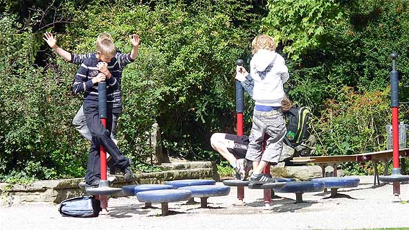 | Der schönere der beiden Türme der Stadtkirche. | Sie drehen durch im Stadtpark. | |