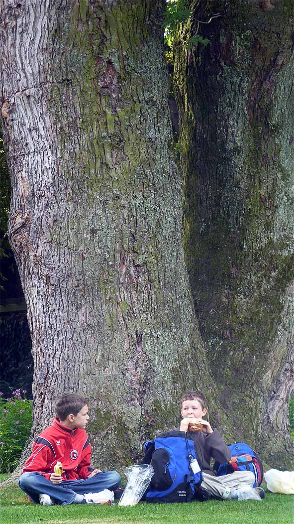 | Gemütlicher Schwatz im Stadtpark. | Mittagessen vor Riesenbaum. | |