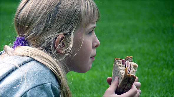 | Svenja beisst ins Brot. | Mittagspause auch für diese Herren. | |