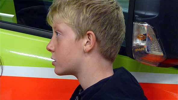 | Lars staunt vor dem Riesenauto. | Alarm - die Fahrt geht los! | |